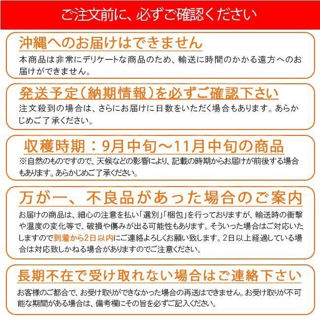 ■長期不在について | お客様のご都合や長期ご不在による配達センターでの保管(2日以上)によって傷みが発生した場合の返品・交換の対応はできません。 お受け取りが不可能な期間がある場合は、備考欄にその旨を必ずご記入ください。