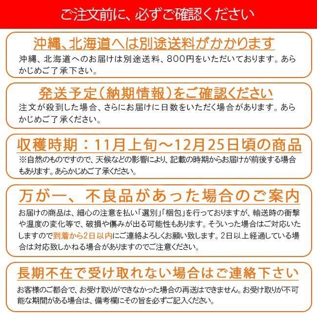 | ■長期不在について | お客様のご都合や長期ご不在による配達センターでの保管(2日以上)によって傷みが発生した場合の返品・交換の対応はできません。 お受け取りが不可能な期間がある場合は、備考欄にその旨を必ずご記入ください。