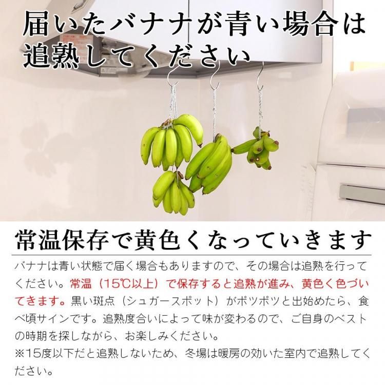 | ■追熟・保存方法 | バナナは青い状態で届く場合もありますので、その場合は常温(15℃以上)で保存すると追熟が進み、黄色く色づいてきます。黒い斑点(シュガースポット)がポツポツと出始めたら、食べ頃サインです。さらに追熟を行うと、黒い部分が多くなり「傷んできたのかな?」と思われますが、皮を剥くと中身白いままで問題ありません。その状態だと酸味より甘味が強く感じられます。追熟度合いによって味が変わるので、ご自身のベストの時期を探しながら、お楽しみください。