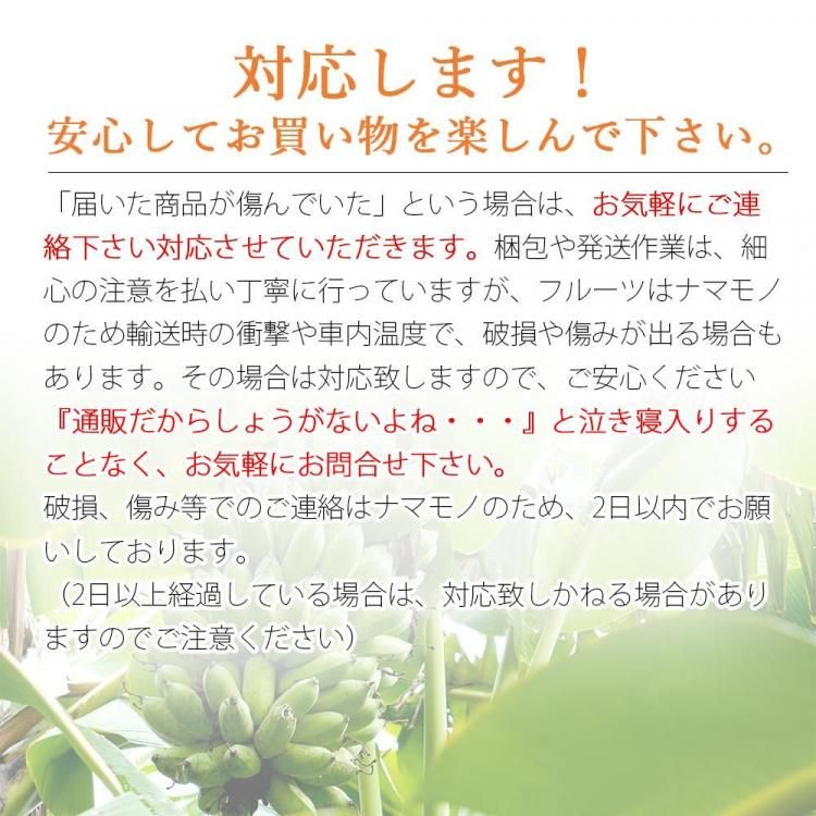| ■不良品について | お届けの商品は、細心の注意を払い「選果」「梱包」を行っておりますが、輸送時の衝撃や温度の変化等で、破損や傷みが出る可能性もあります。そういった場合はご対応いたしますので、到着から2日以内にご連絡お願い致します。2日以上経過している場合は対応致しかねる場合がありますのでご注意ください。