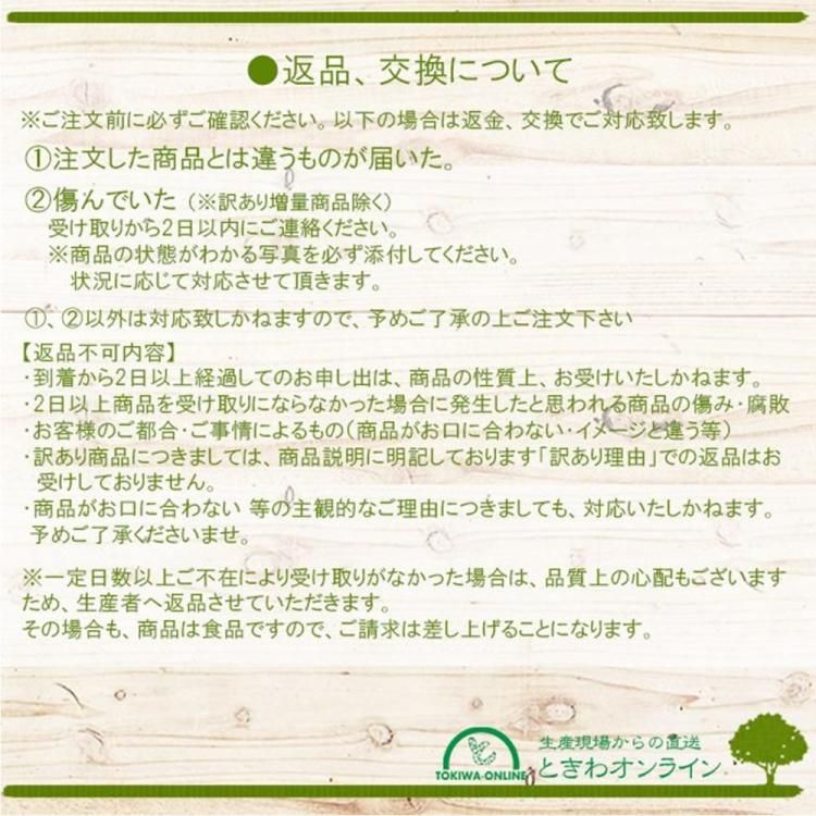 | ■不良品について | お届けの商品は、細心の注意を払い「選果」「梱包」を行っておりますが、輸送時の衝撃や温度の変化等で、破損や傷みが出る可能性もあります。そういった場合はご対応いたしますので、到着から2日以内にご連絡お願い致します。2日以上経過している場合は対応致しかねる場合がありますのでご注意ください。