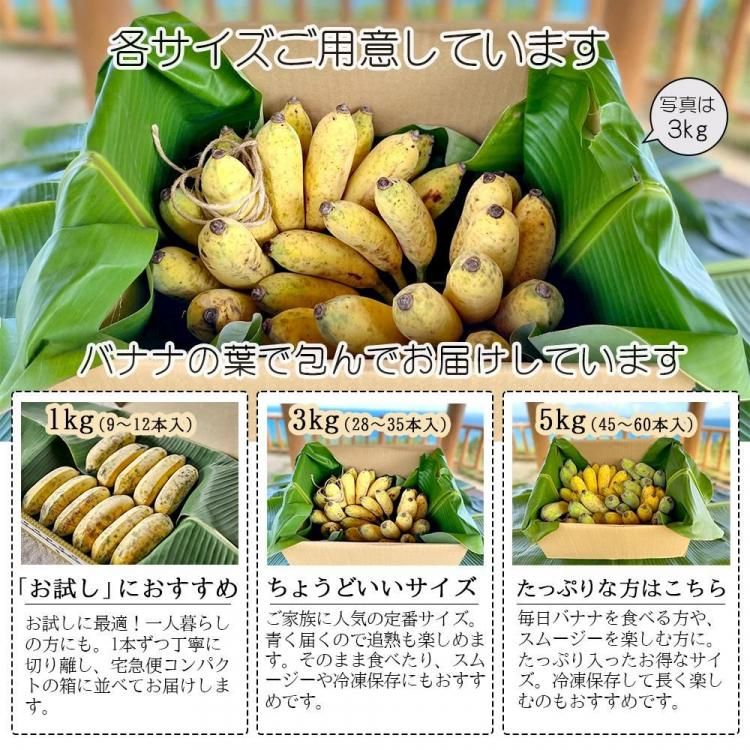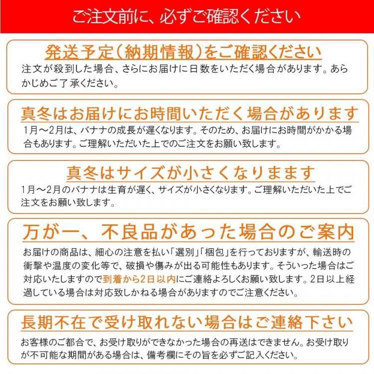 | ■サイズ | 不選別(おまかせ)※1月〜2月のバナナは生育が悪く、サイズが小さくなります。ご理解ご了承お願い致します。 |